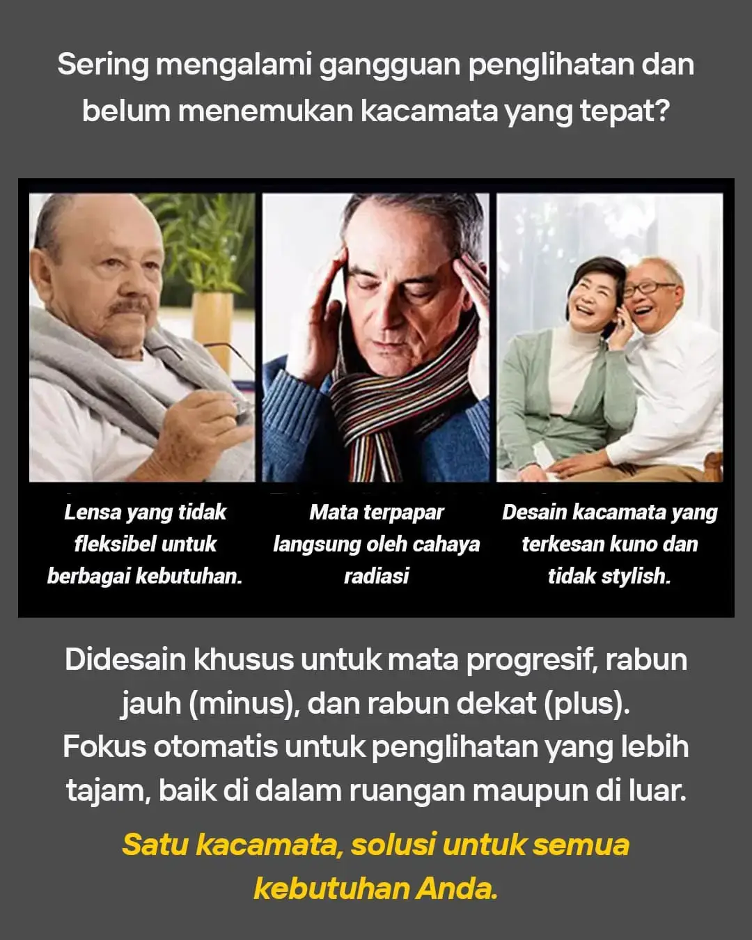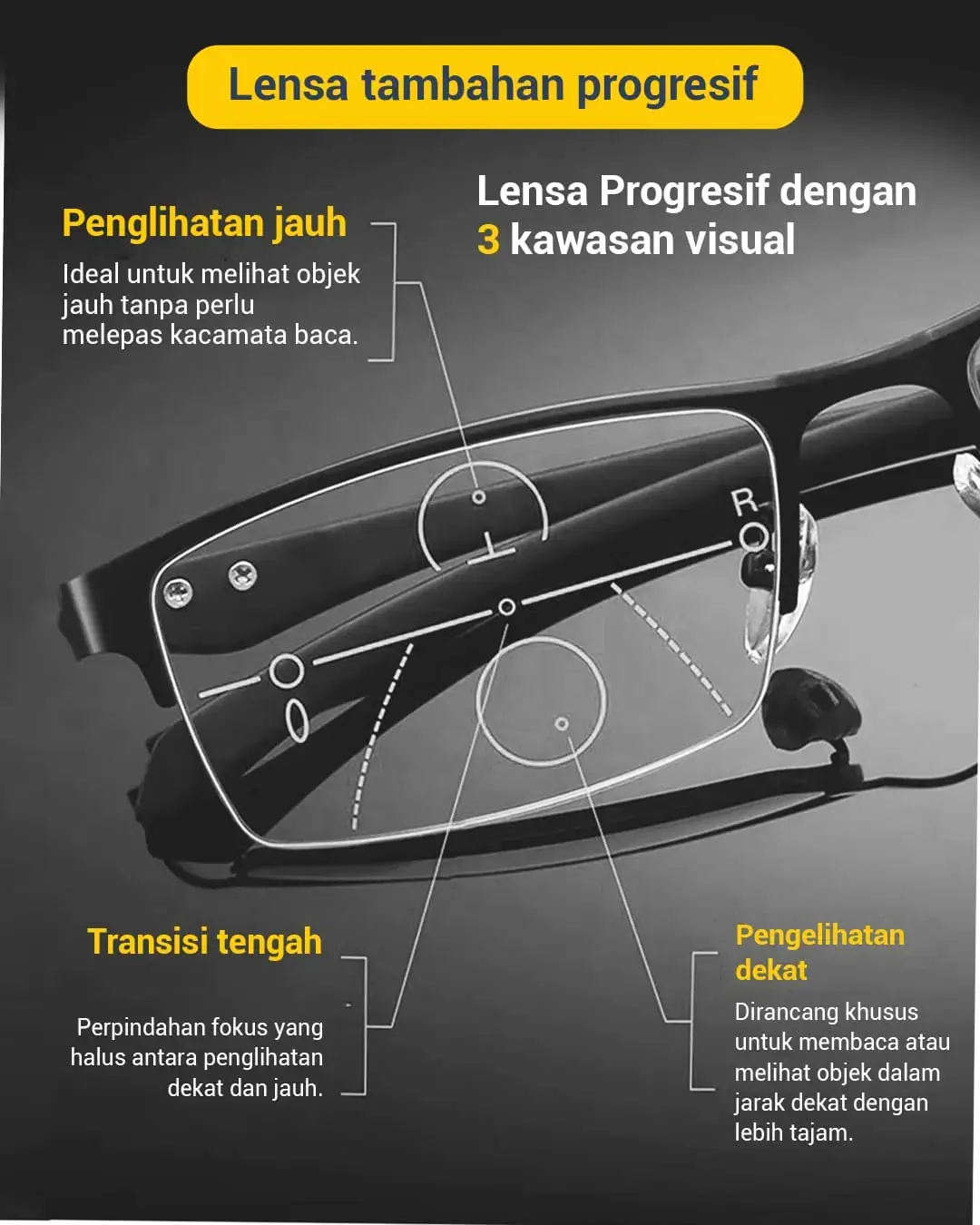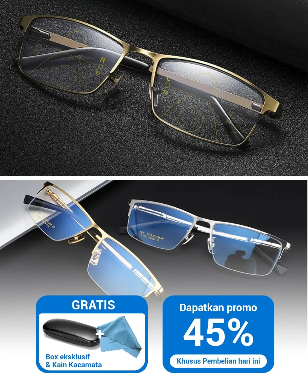 Note : kacamata yang bisa dipakai oleh pria dan wanita, dengan lensa progresif yang menyesuaikan jarak jauh dan dekat.