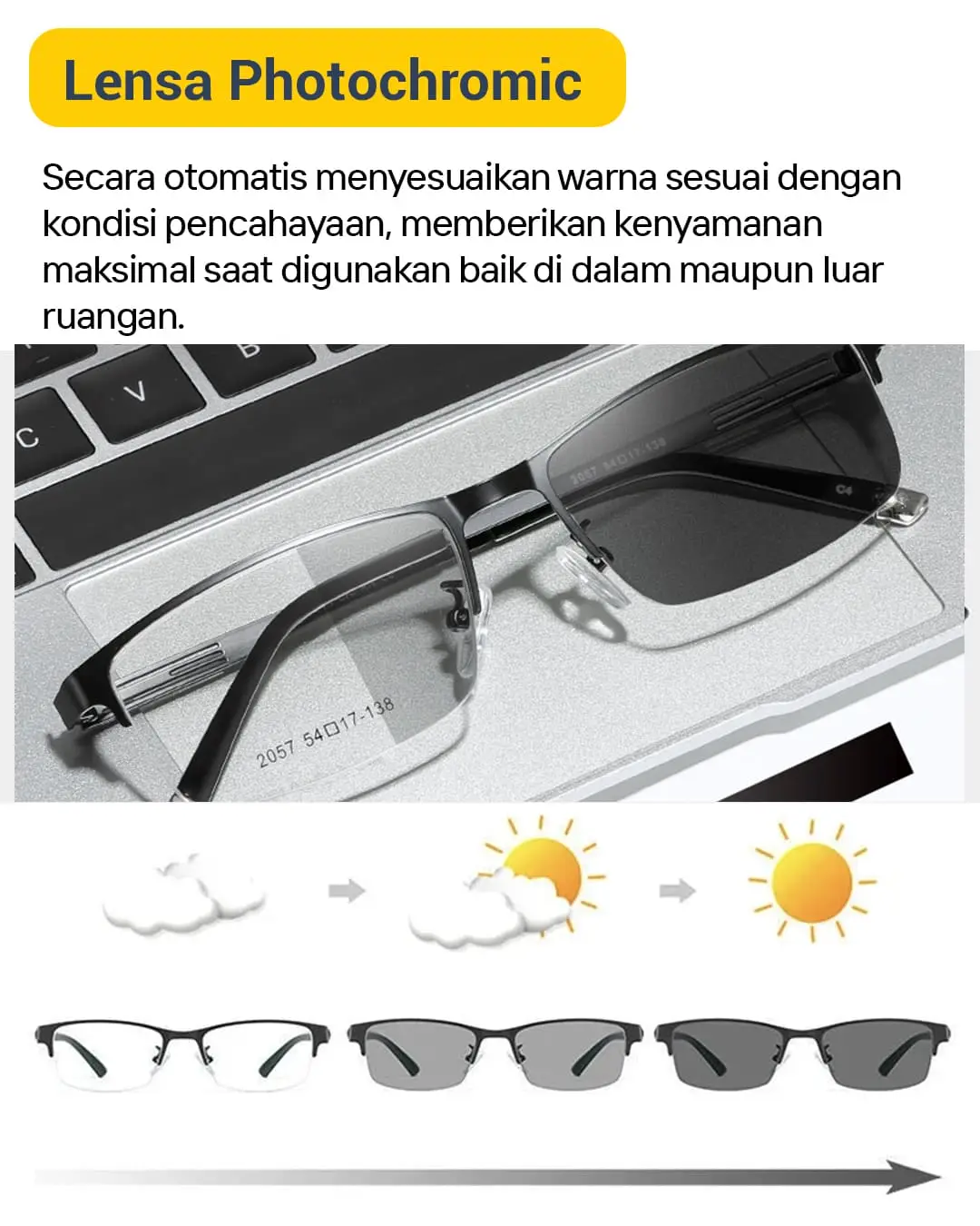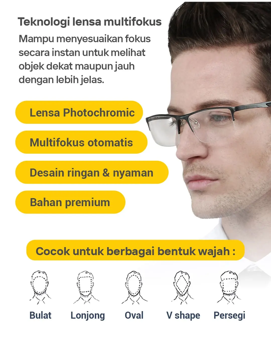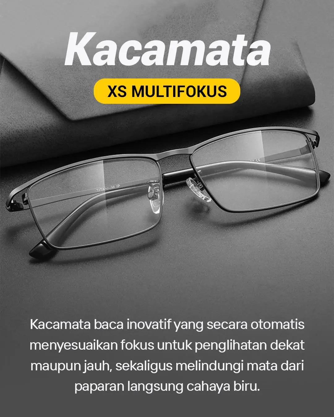 Note : kacamata yang bisa dipakai oleh pria dan wanita, dengan lensa progresif yang menyesuaikan jarak jauh dan dekat.